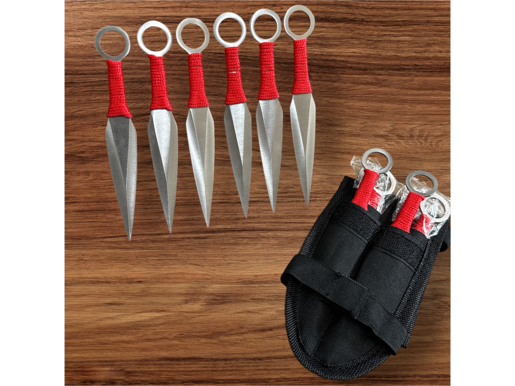 Ефектний набір з шести метальних ножів з обмоткою рукояті червоним нейлоновим шнуром.